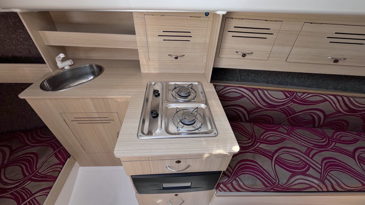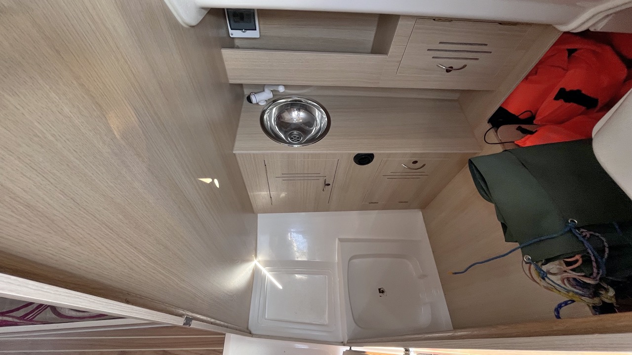 Wyposażenie dodatkowe: bramka do kladzenia masztu, sztywny sztag, roll fok, lazzy jack, instalacja wody - zbiornik, radio, mp3, lodówka, ogrzewanie, instalacja 230 V